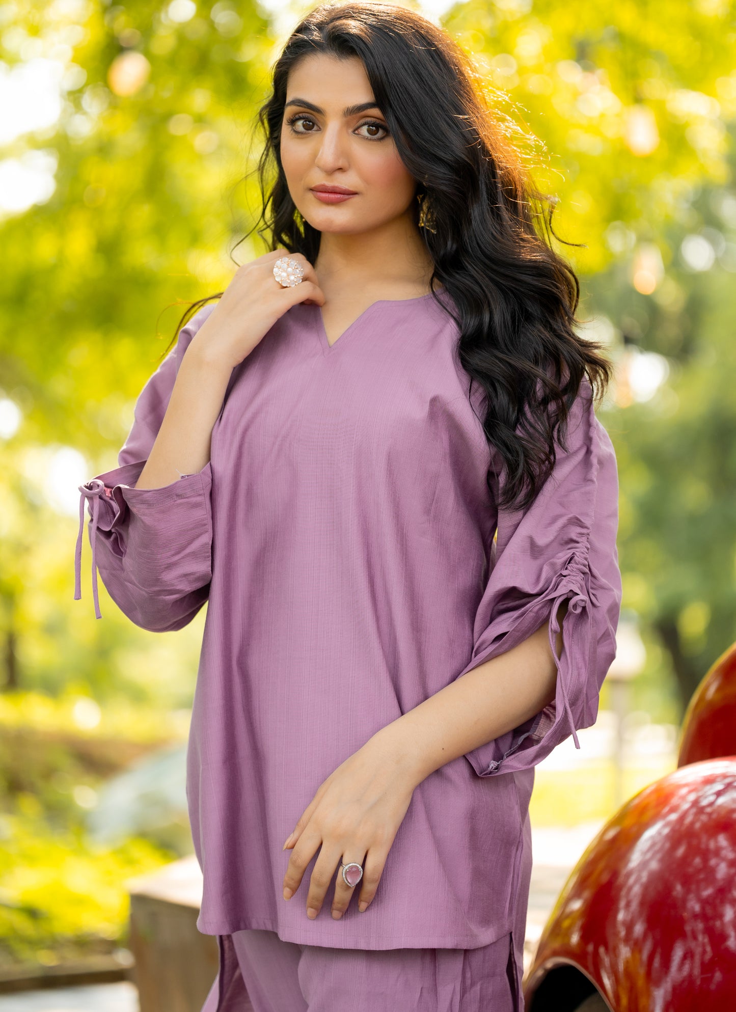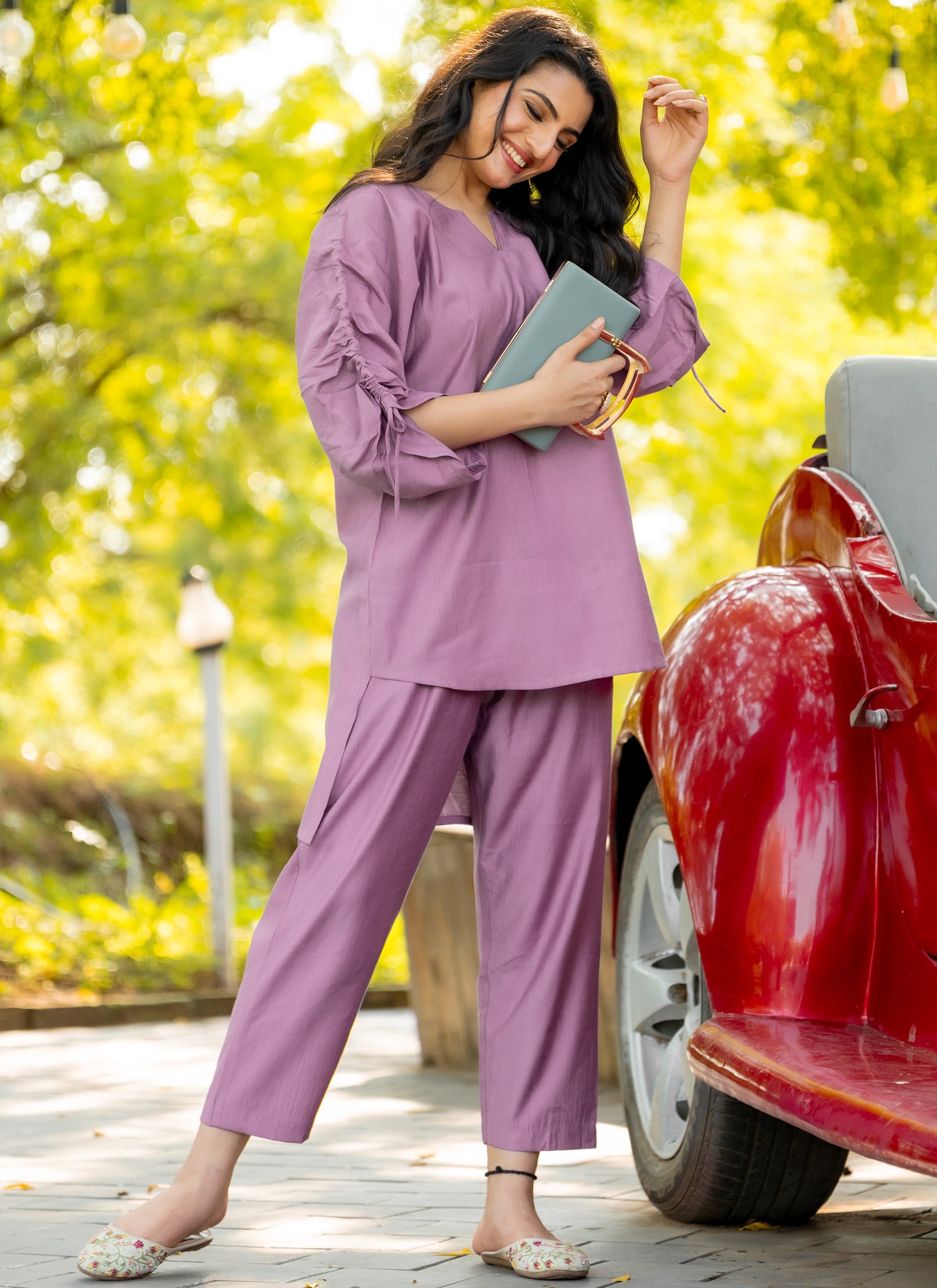- Style :- Length : 34(inch) | Pattern : Co-ord set | Occasion : Festive, Party, Casual | Type : Straight | Sleeve Type : 3/4 Sleeves | Color : purple